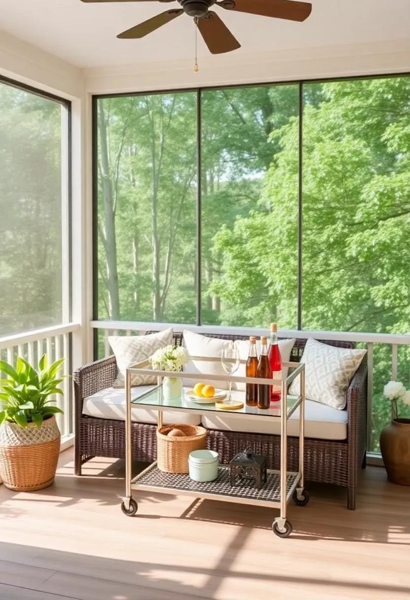 Enhancing your screened porch with a small bar cart tailored for snacks and drinks adds a touch of convenience and charm. This cozy setup not only invites relaxation but also makes it easy to enjoy refreshments while getting lost in a good book. Consider featuring a mix of your favorite beverages and light bites to keep the atmosphere inviting. You might include: